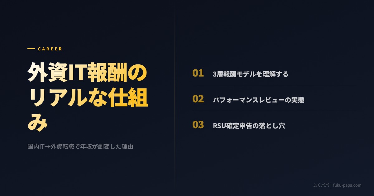 外資ITの報酬は3層構造(基本給・ボーナス・RSU)で理解する。評価は自己申告型で、成果を言語化する力が直結する。RSUは税務上の処理が必要で、確定申告を避けられない。