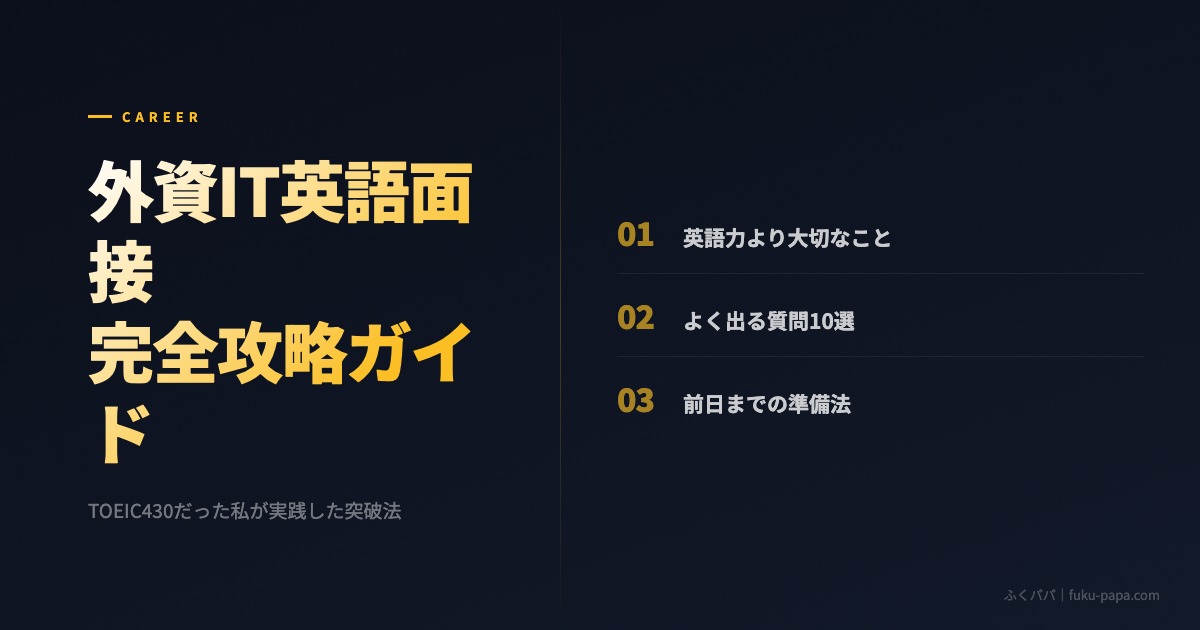 外資IT転職の英語面接で問われているのは、英語の完璧さより「伝えようとする姿勢」。よく出る10の質問を準備し、STARフォーマットで答える練習をするだけで、突破できる可能性は大きく上がる。