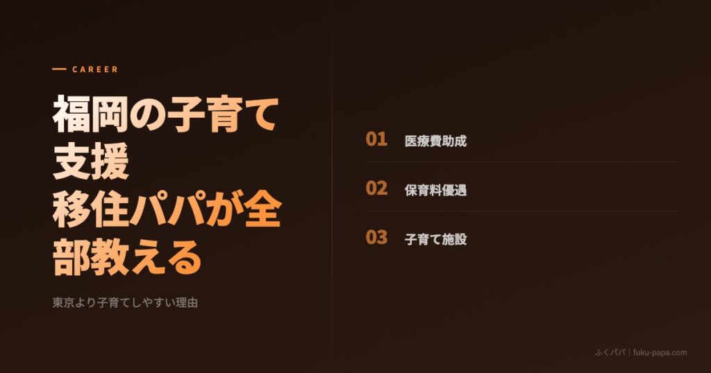 「福岡って子育て支援どうなの?」 東京から福岡に移住して2年。3歳の娘を育てるフルリモートパパとして実感していることがあります。 福岡の子育て支援は、想像以上に手厚い。 この記事では、福岡市の子育て支援制度を「移住パパ目線」で整理しました。公... -